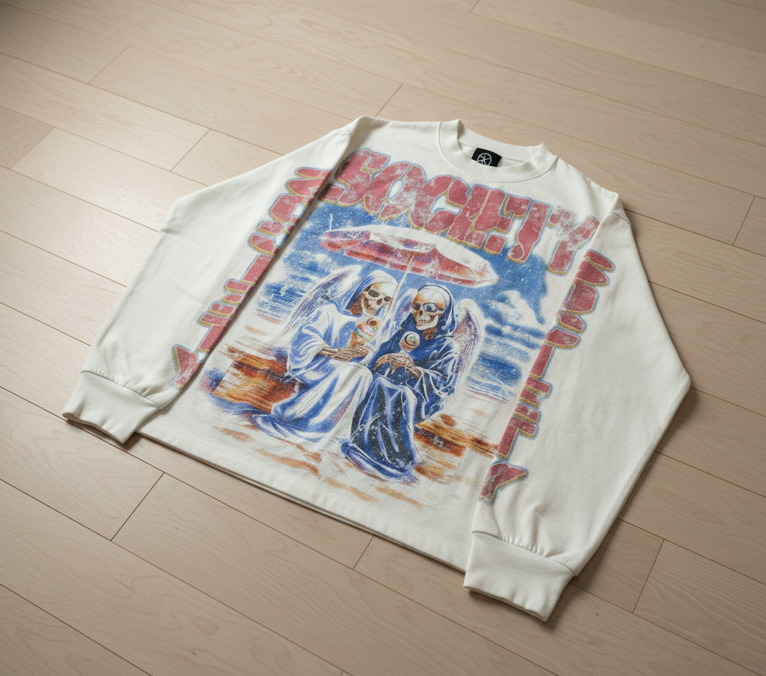 Crafted from premium 290 GSM cotton, this tee gives you that heavyweight, oversized fit with a soft feel and bold street-ready energy. The front design features two skeleton angels sharing ice cream under a candy sky — symbolizing the sweetness of loyalty and staying down through it all. The back artwork brings it full circle with “In Society We Trust” and “Members Only” detailing — reminding everyone it’s deeper than fashion.